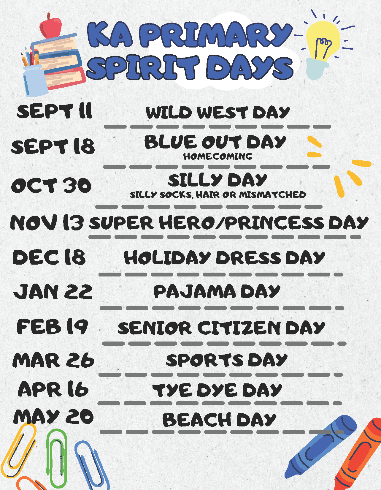 Spirit Days are fun days that our students get to dress up and show their school spirit. More information will be provided about these days as they come up throughout the school year. Please be on the look out for flyers and info on our newsletters about not only these days but other important news as well.